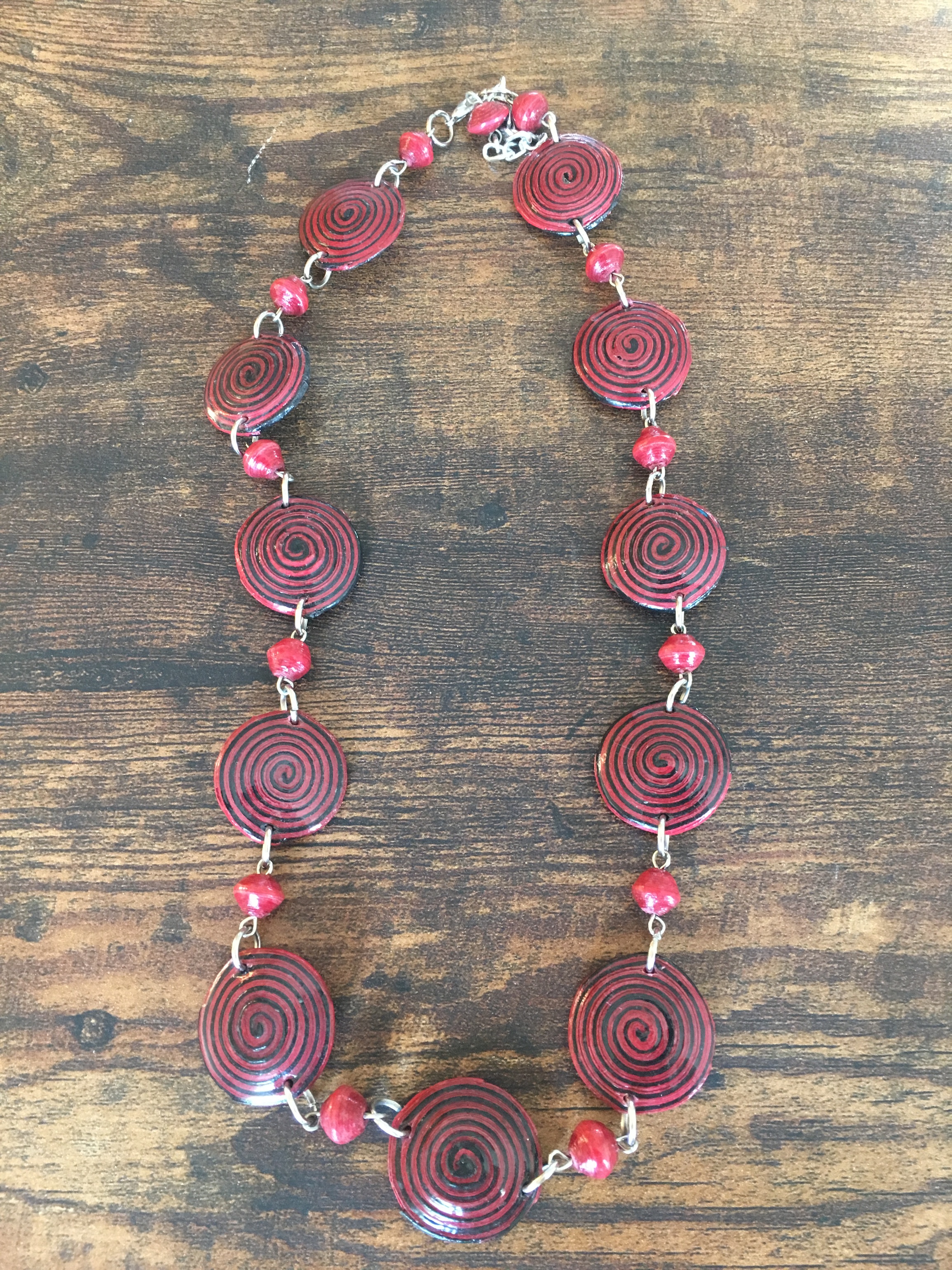 Bright pops of cherry red disk shaped beads surround this beauty. The shape of these beads is truly unique and is our only item featuring this style!