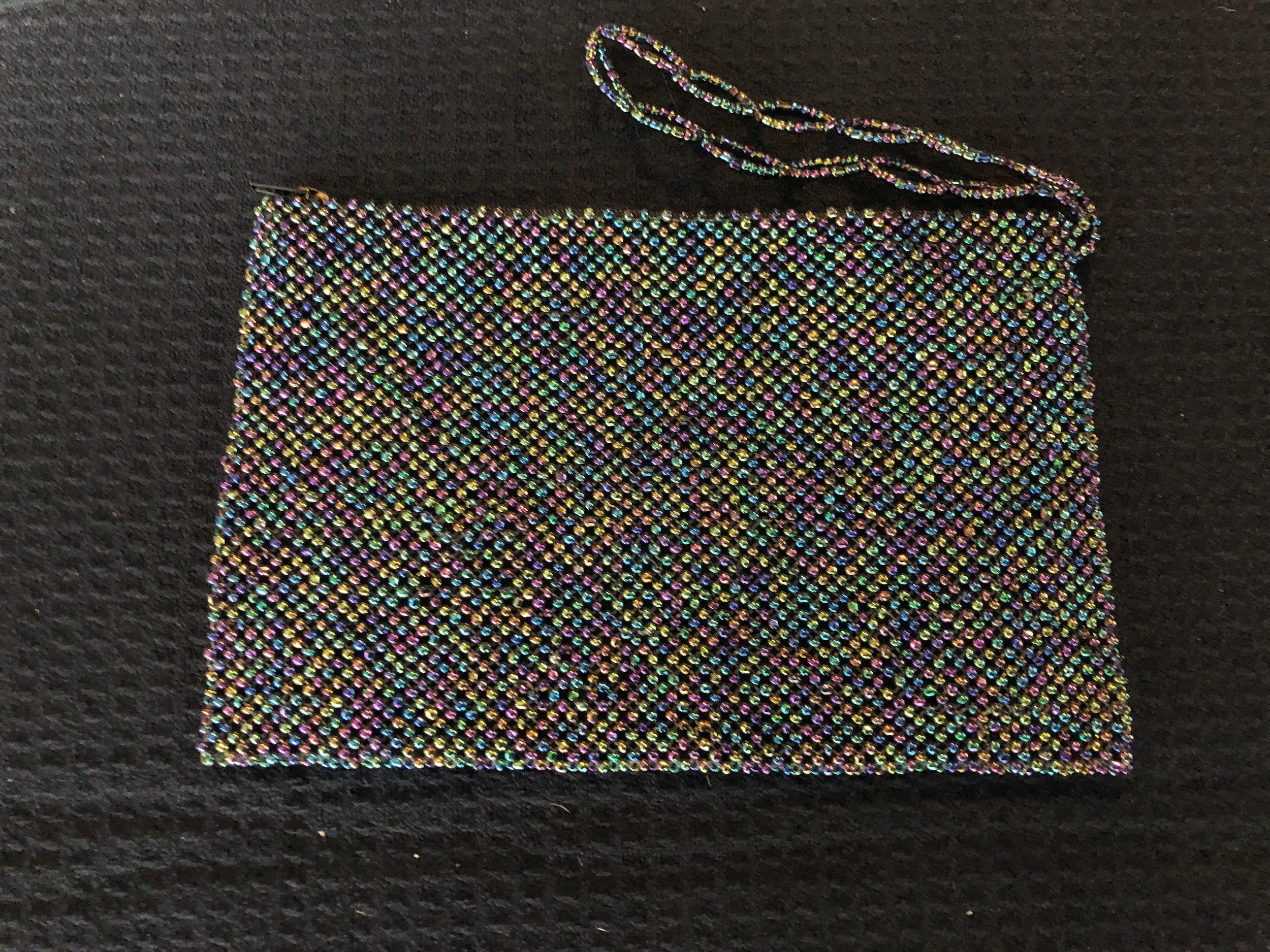 This wristlet is the perfect size for stashing your phone and a credit card and the wrist strap makes it easy to hang on to! Made entirely of small seed beads.