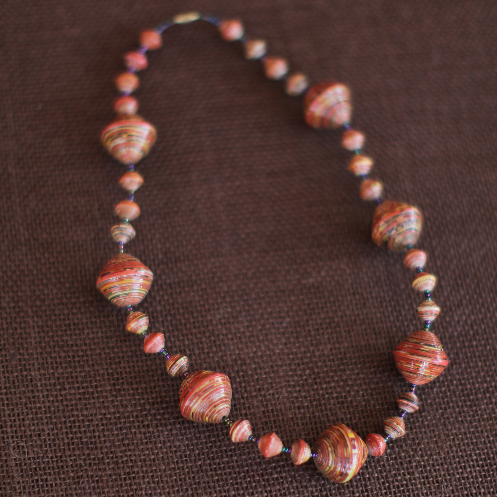 Every bead is handcrafted from 100% recycled paper. Each bead is carefully rolled creating it's unique and distinctive design. Because each item is uniquely handmade and crafted, each photo is a close example but not exact replica.