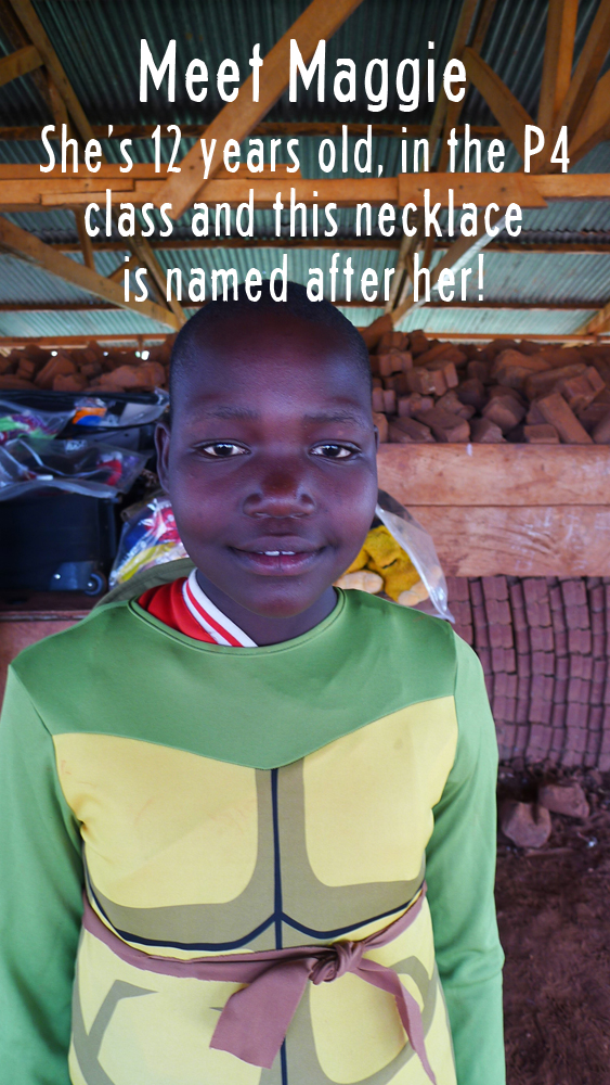The Maggie necklace is best worn paired with others and against a neutral colored outfit to stand out. Each bead is neither sphere nor cylinder but almost diamond shaped. Vibrant colors. 27 inches in length.