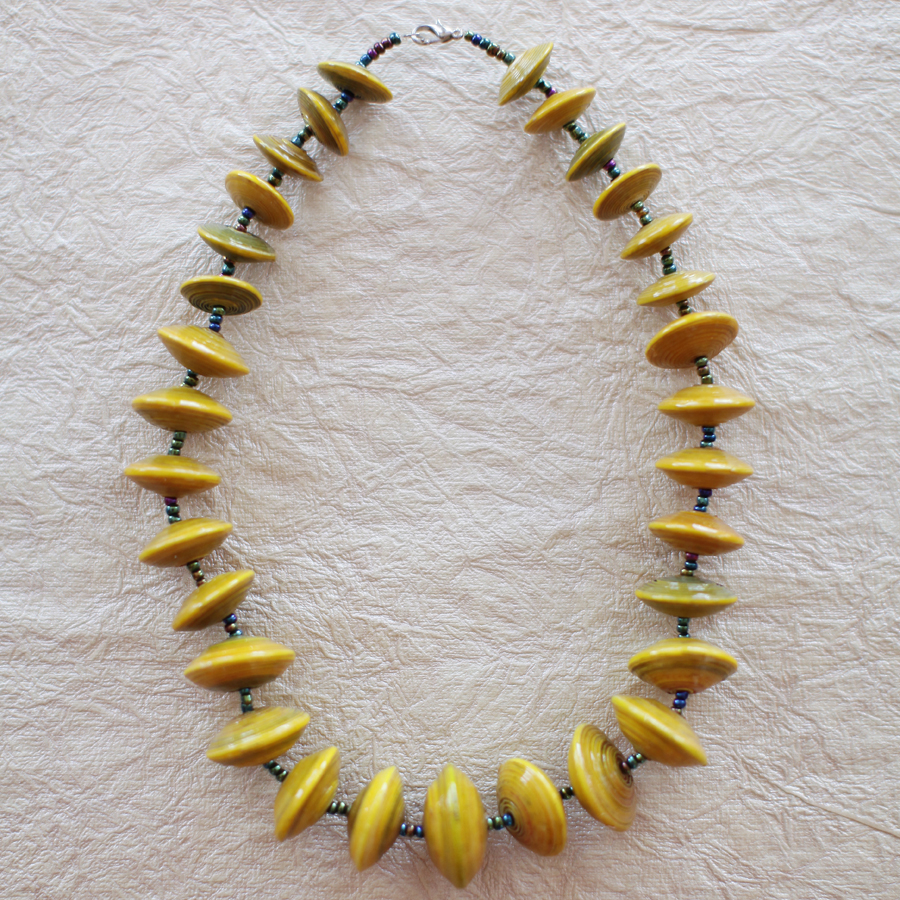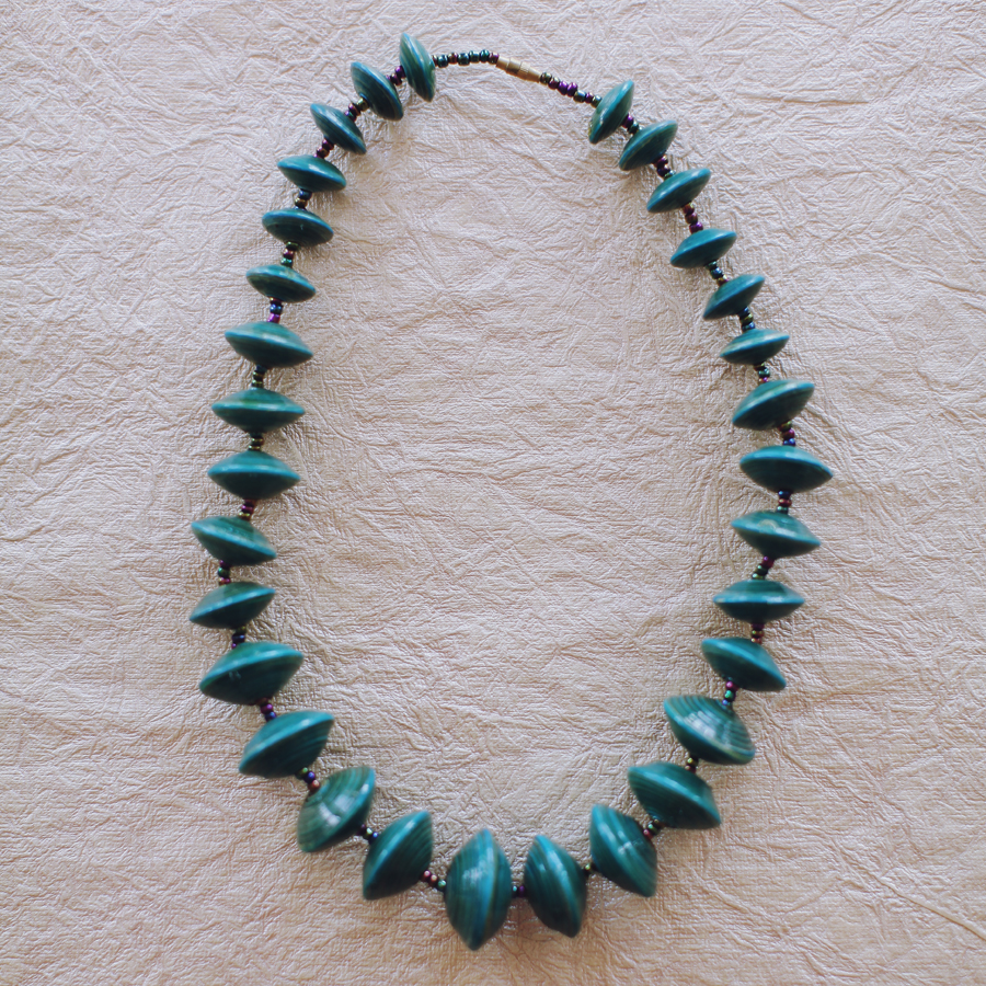 The Ritah features a bead unlike any of our recycled paper beads. With a unique disk shape and smaller beads in between, no need to layer as it stands out on it's own. Short collar length. Vibrant tones, short collar. Approximately 19 inches in length.